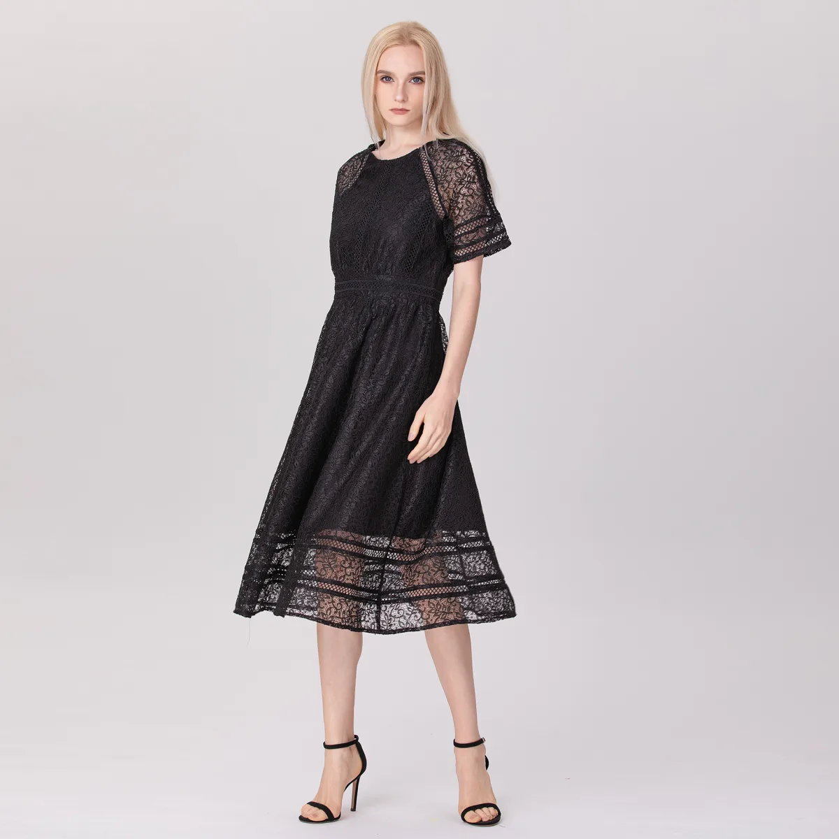Een stuk gemaakt van delicaat kant met bloemmotieven. Transparante snit aan de zoom en mouwen, die het silhouet op elegante wijze accentueert: aansluitende taille, rokvolume dat uitloopt tot aan de knie. Een set gekruiste vlechten die de mouwraglans, taille, buste en zomen structureren. Een verfijnde en ademende jurk, ideaal voor het zomerseizoen. Het is geschikt voor semi-formele gelegenheden zoals bruiloften, recepties of tuinfeesten. Productdetails: De volledige lengte bedraagt 121 cm. Het model draagt maat 10 en haar lengte is 5"7. Vorm: aansluitend en vervolgens wijd uitlopend Ronde halslijn Korte mouwen Onzichtbare ritssluiting midden op de rug