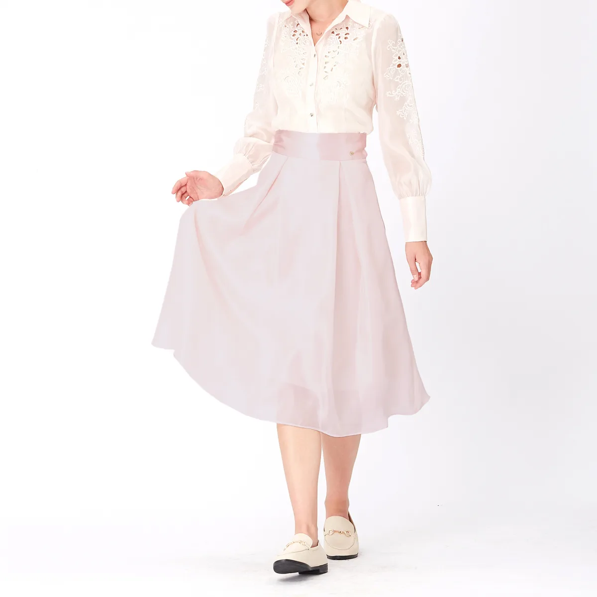 Een geavanceerd stuk royaal wijd uiteen door diepe plooien die beginnen vanuit de taille. De hele rok wordt in een organza gesneden en versierd met een grote riem met horizontale plooien in satijn, met één decoratieve knop aan de zijkant. Om te dragen met blouses, shirts, crop-tops en jassen of blazers, voor elegante en semi-formele gelegenheden. Productdetails: Lengte: 78 cm Model draagt maat 10 Modelhoogte is 5 "7 Vorm: uitlopen Onzichtbare rits aan de linkerkant