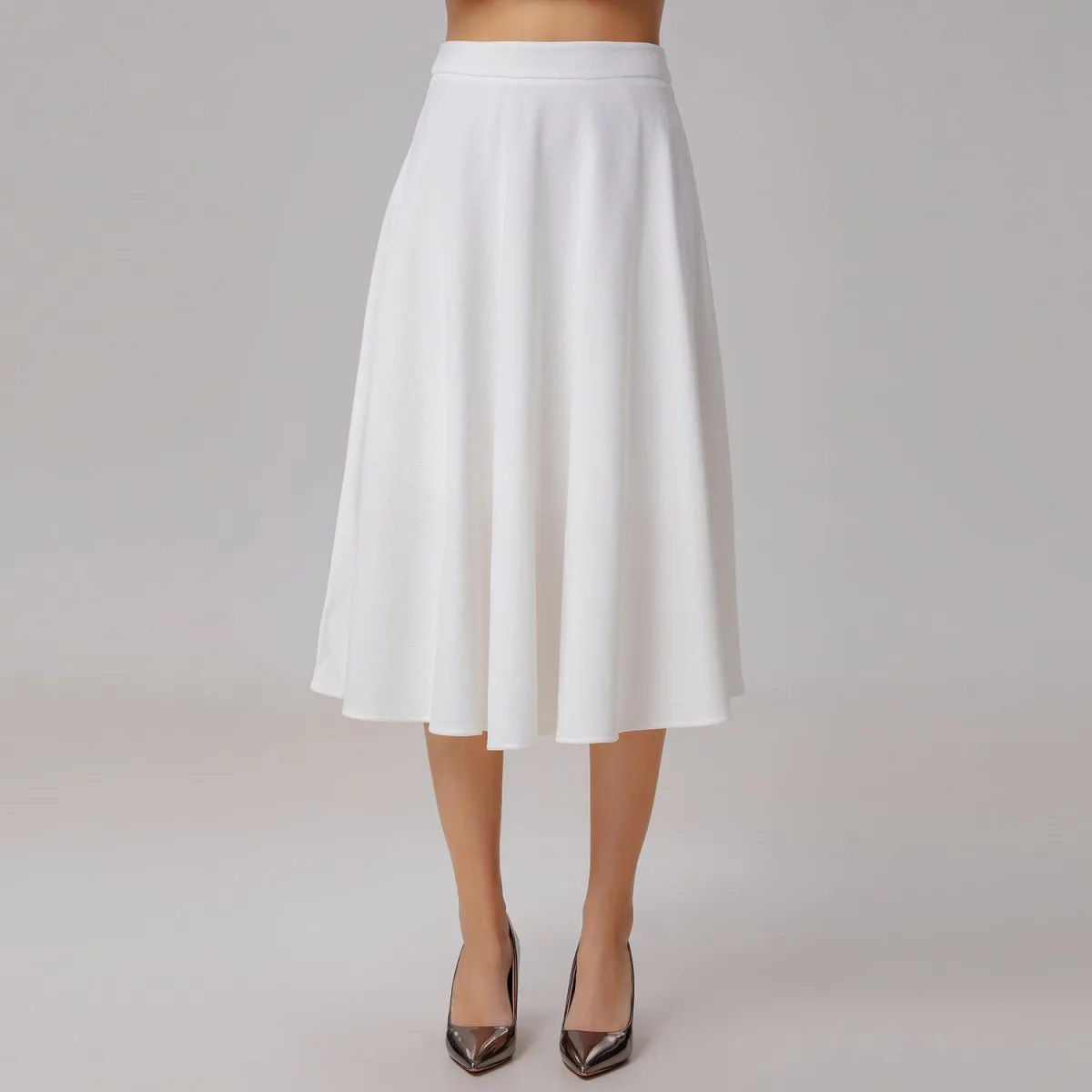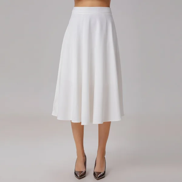 Een zeer wijd uitlopende rok die tot aan de kuiten reikt en is gemaakt van zacht, soepel materiaal met een elegante drapering. Combineer met blouses, shirts, truien en blazers. Een onmisbaar kledingstuk voor elke garderobe, geschikt voor dagelijks gebruik, gelegenheden in de stad of feestelijke dansevenementen. Productdetails: Vorm: trapeziumvormig, zeer wijd uitlopend Lengte: 80 cm Onzichtbare rits middenachter