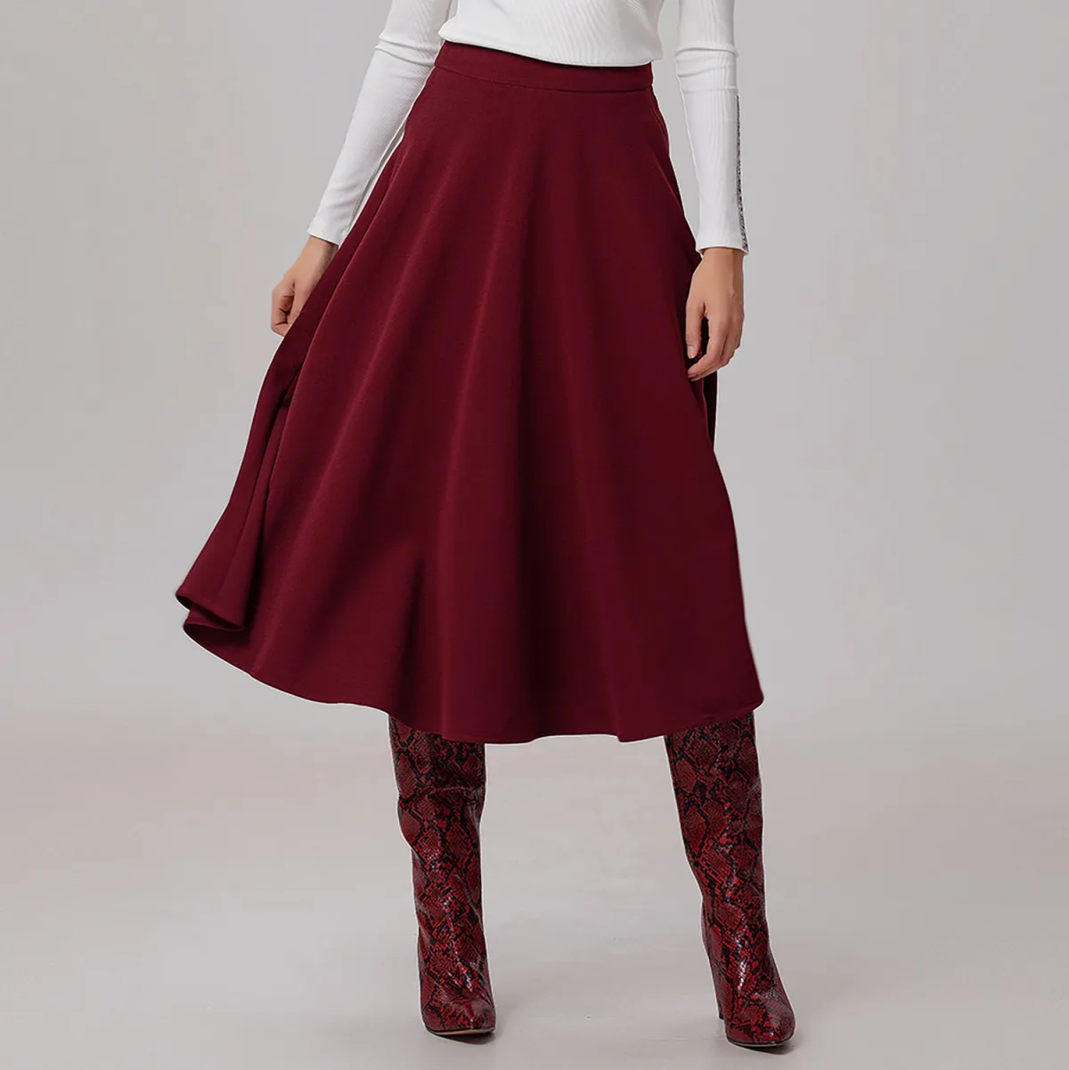 Een zeer wijd uitlopende rok die tot aan de kuiten reikt en is gemaakt van zacht, soepel materiaal met een elegante drapering. Combineer met blouses, shirts, truien en blazers. Een onmisbaar kledingstuk voor elke garderobe, geschikt voor dagelijks gebruik, gelegenheden in de stad of feestelijke dansevenementen. Productdetails: Vorm: trapeziumvormig, zeer wijd uitlopend Lengte: 80 cm Onzichtbare rits middenachter