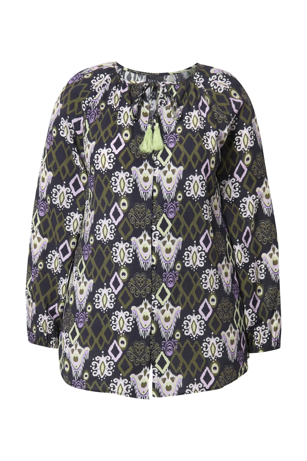 Blouse type: Blouseshirt; Design: Met band/snoer; Materiaal: Viscose; Motief: Drukke print; Kraag: Tuniek kraag; Extra's: Op staal naden; Pasvorm: Normale pasvorm; Armlengte: Lange mouw; Lengte: Normale lengte