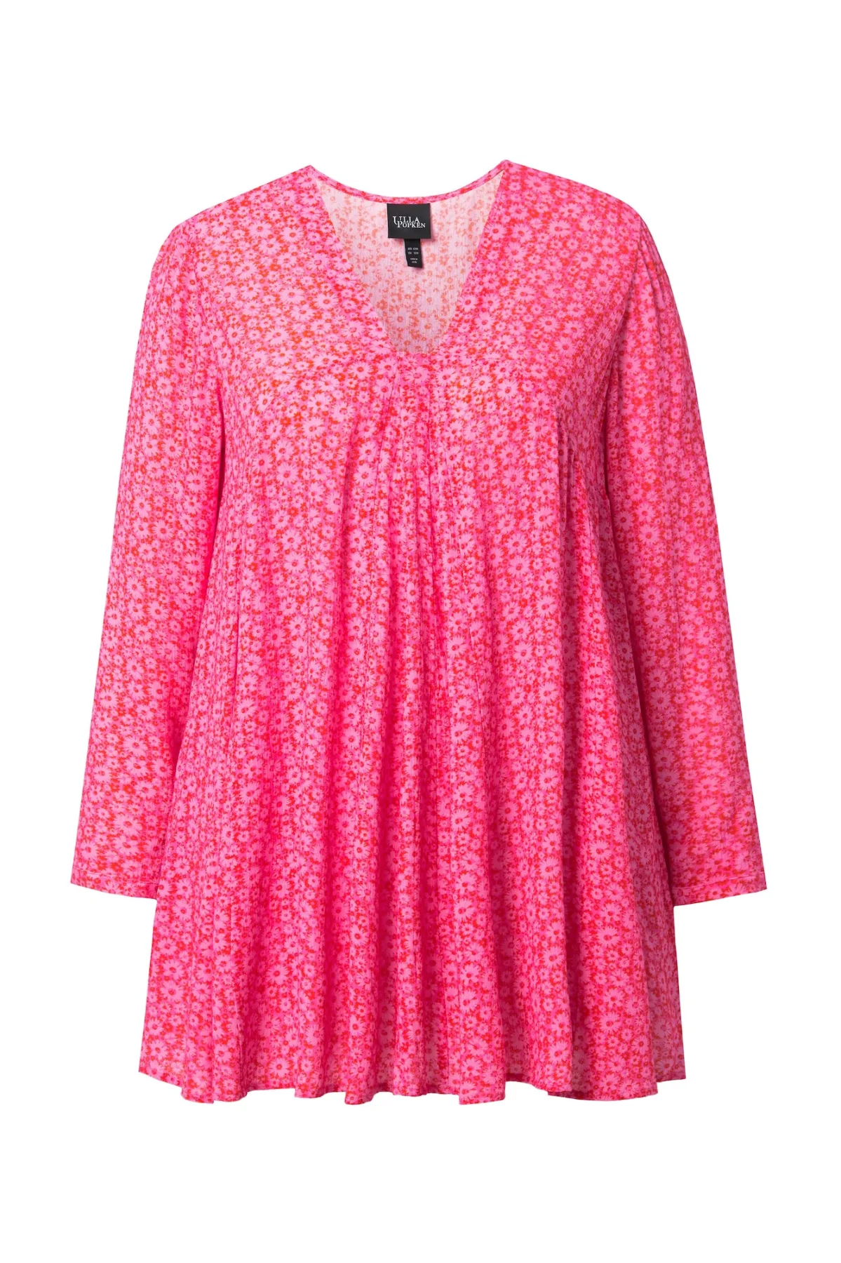 Blouse type: Blouseshirt; Design: Gevoerde zoom/rand, A-lijn, Flare; Materiaal: Crêpe; Motief: Bloemenprint; Kraag: Zonder kraag; Details: Plooien; Extra's: All-over patroon, Gladde stof, Voelt zacht aan; Pasvorm: Losse pasvorm; Armlengte: Lange mouw; Lengte: Lange pasvorm