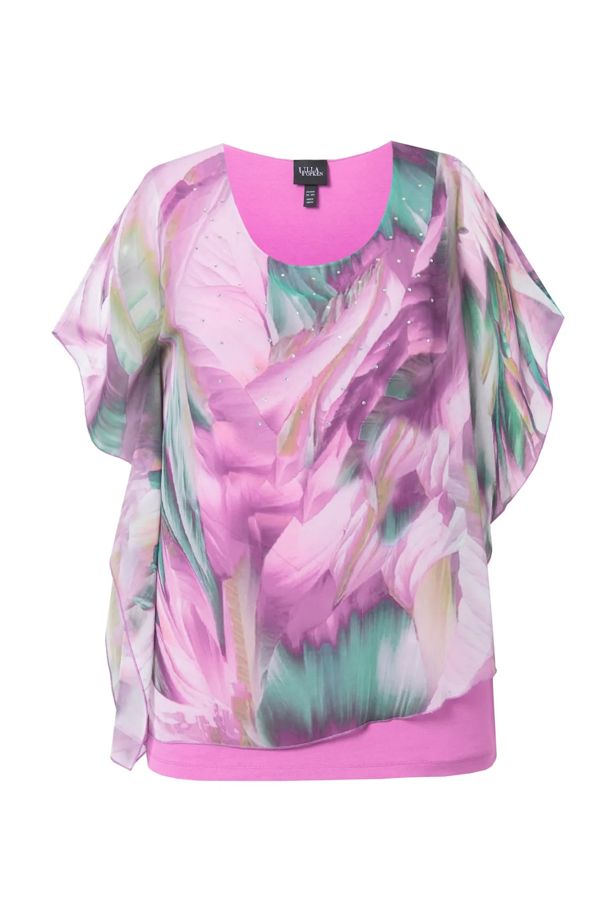Blouse type: Wijde blouse; Design: Asymmetrische zoom, Overcut schouder; Materiaal: Chiffon; Motief: Bloemenprint; Kraag: Zonder kraag; Details: Peplum; Extra's: Met halfedelstenen, Licht transparant; Pasvorm: Normale pasvorm; Armlengte: Halve mouw; Lengte: Normale lengte