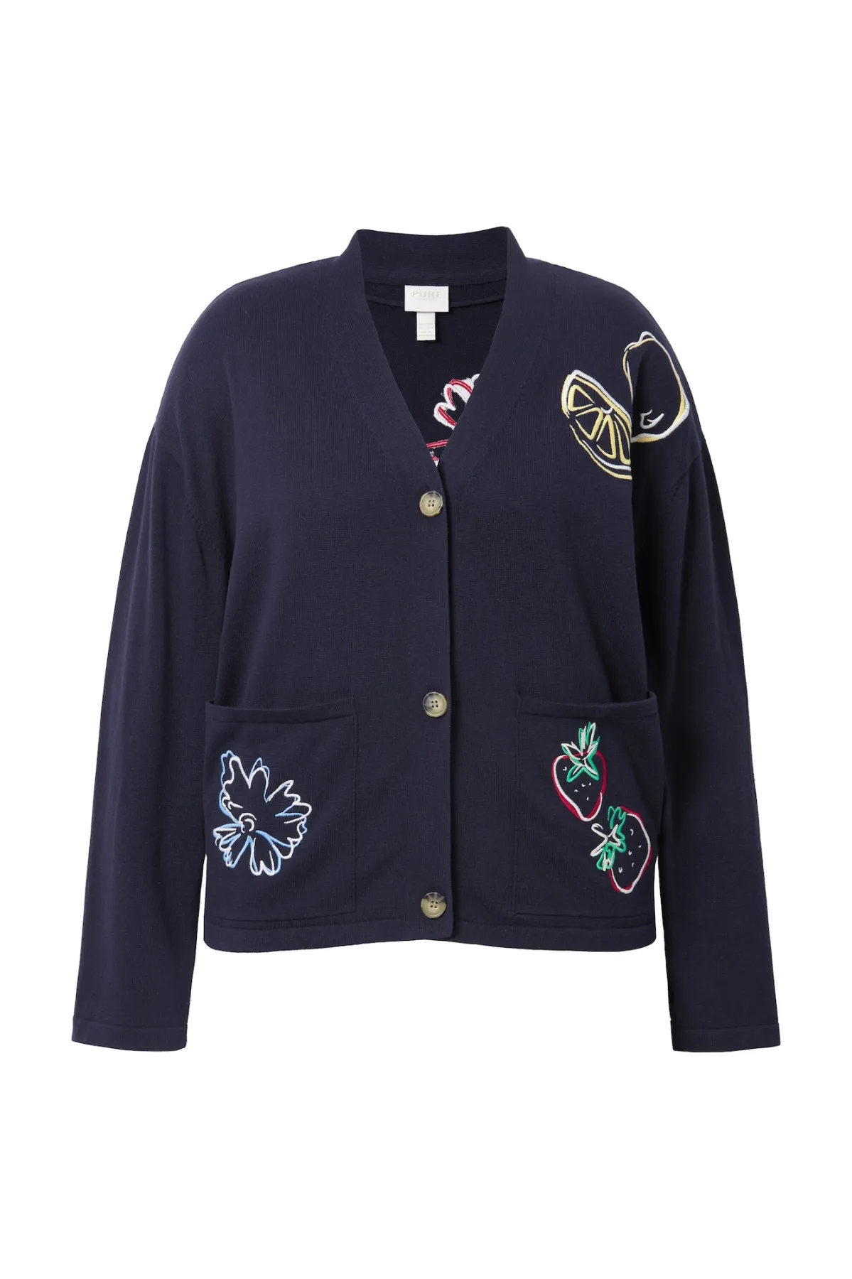 Design: Knop sluiting; Materiaal: Knitwear; Halstype: V-hals; Details: Borduursels; Extra's: Op staal naden; Pasvorm: Normale pasvorm; Armlengte: Lange mouw; Lengte: Normale lengte