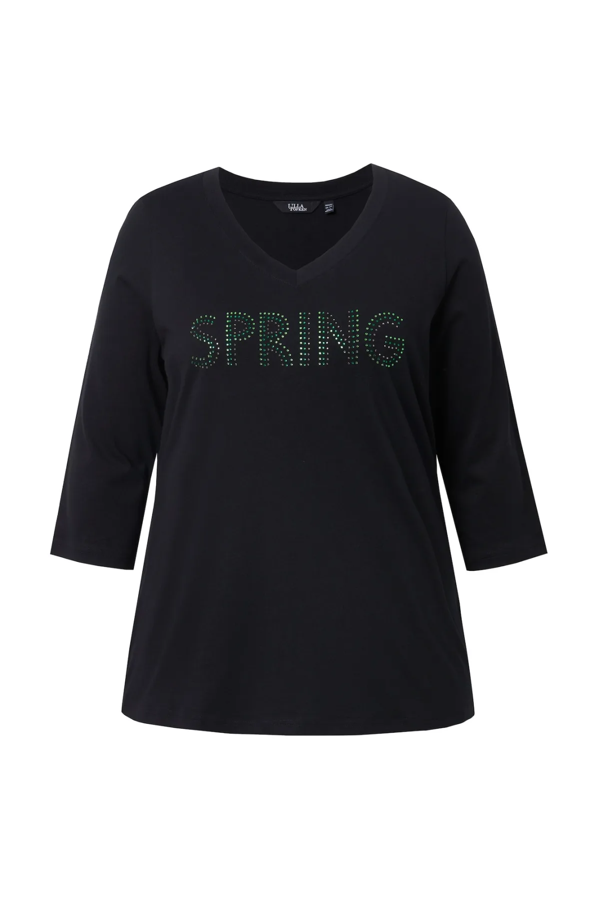 Design: Gevoerde zoom/rand, Rechte zoom, Nektape; Materiaal: Jersey; Halstype: V-hals; Motief: Tekst print; Details: Sierstenen; Extra's: Met halfedelstenen, Glitterend, Op staal naden, Voelt zacht aan; Pasvorm: Losse pasvorm; Armlengte: Driekwart mouw; Lengte: Normale lengte