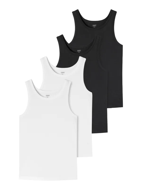 Design: Gevoerde zoom/rand; Materiaal: Katoen; Halstype: Ronde hals; Motief: Effen; Extra's: Op staal naden; Aantal: 4 Pack; Armlengte: Mouwloos