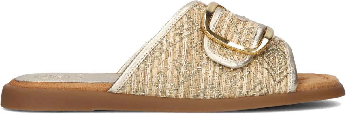 Stap in de zomerse vibe met de CRAY slippers van UNISA! Deze trendy schoenen zijn perfect voor een dagje strand of een relaxte wandeling in de stad. Het bovenwerk bestaat uit goudkleurig metallic leer met raffia. In het raffia zitten gouddraadjes. De slippers passen goed bij een luchtige zomerjurk of een casual jeans en T-shirt outfit. Met de CRAY slippers aan je voeten ben je helemaal klaar voor de warme dagen.