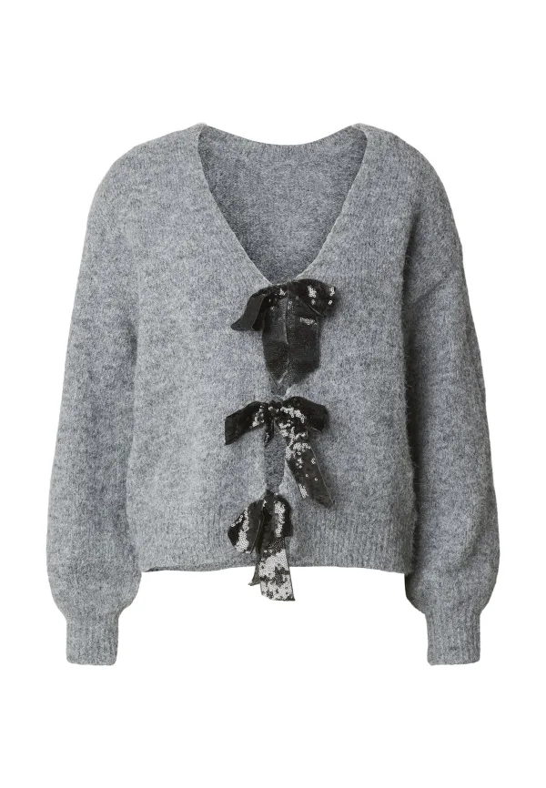 Design: Geribd ceintuurtje, Overcut schouder, Om te knopen/binden; Type sluiting: Koord; Materiaal: Knitwear; Halstype: V-hals; Motief: Effen; Details: Pailletten; Extra's: Op staal naden; Pasvorm: Normale pasvorm; Armlengte: Lange mouw; Lengte: Normale lengte