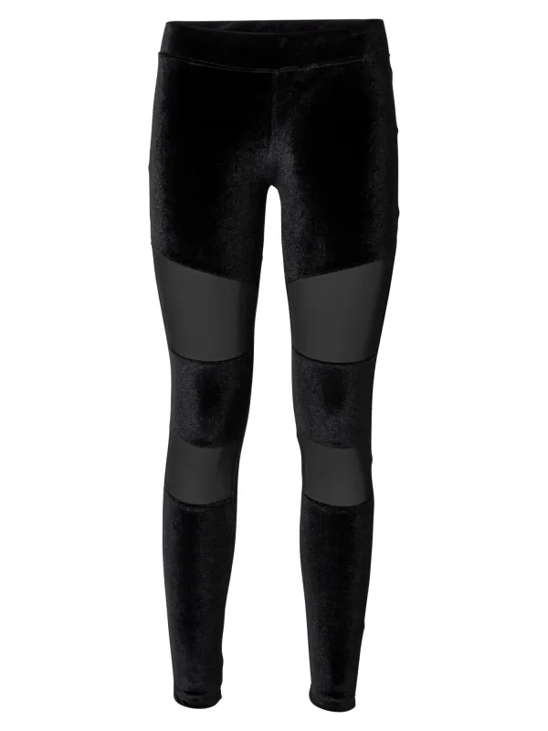 Deze warme en pittige legging is gebaseerd op een geraffineerde materiaalmix van glinsterend stretchfluweel en doorschijnend mesh. De inzetstukken van mesh op de dijen en knieën laten de onderliggende huid zien. Het zachte fluwelen materiaal contrasteert perfect met het gaas. Natuurlijk past de legging als een tweede huid. De snit is laag en voor een optimale pasvorm blijft de tailleband elastisch.Buitenkant stof 1: 92 % polyester 8 % elastaan, stretch velours, 200 g/m2.Buitenkant stof2:90 % polyester 10 % elastaan, functioneel netweefsel, 180 g/m2.