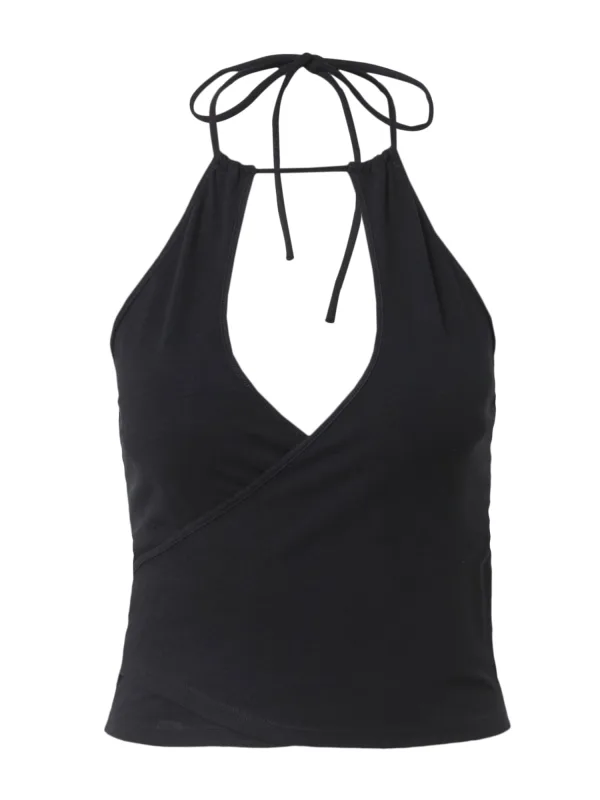 Design: Gevoerde zoom/rand, Diepe snit/decolleté, Om te knopen/binden; Materiaal: Jersey; Halstype: V-hals; Motief: Effen; Soort bandjes: Haltermodel; Details: Wikkel design; Extra's: Op staal naden, Voelt zacht aan, Huidvriendelijk materiaal; Pasvorm: Slanke pasvorm; Armlengte: Mouwloos; Lengte: Korte pasvorm