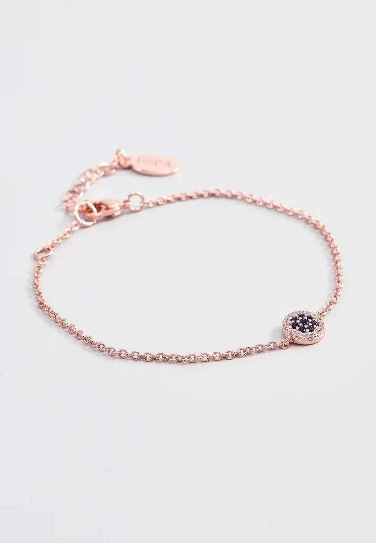 15+4 cm armband van roségoud verguld metaal met een centraal rond element met witte en donkerblauwe kristallen. Gepersonaliseerd logolabel.