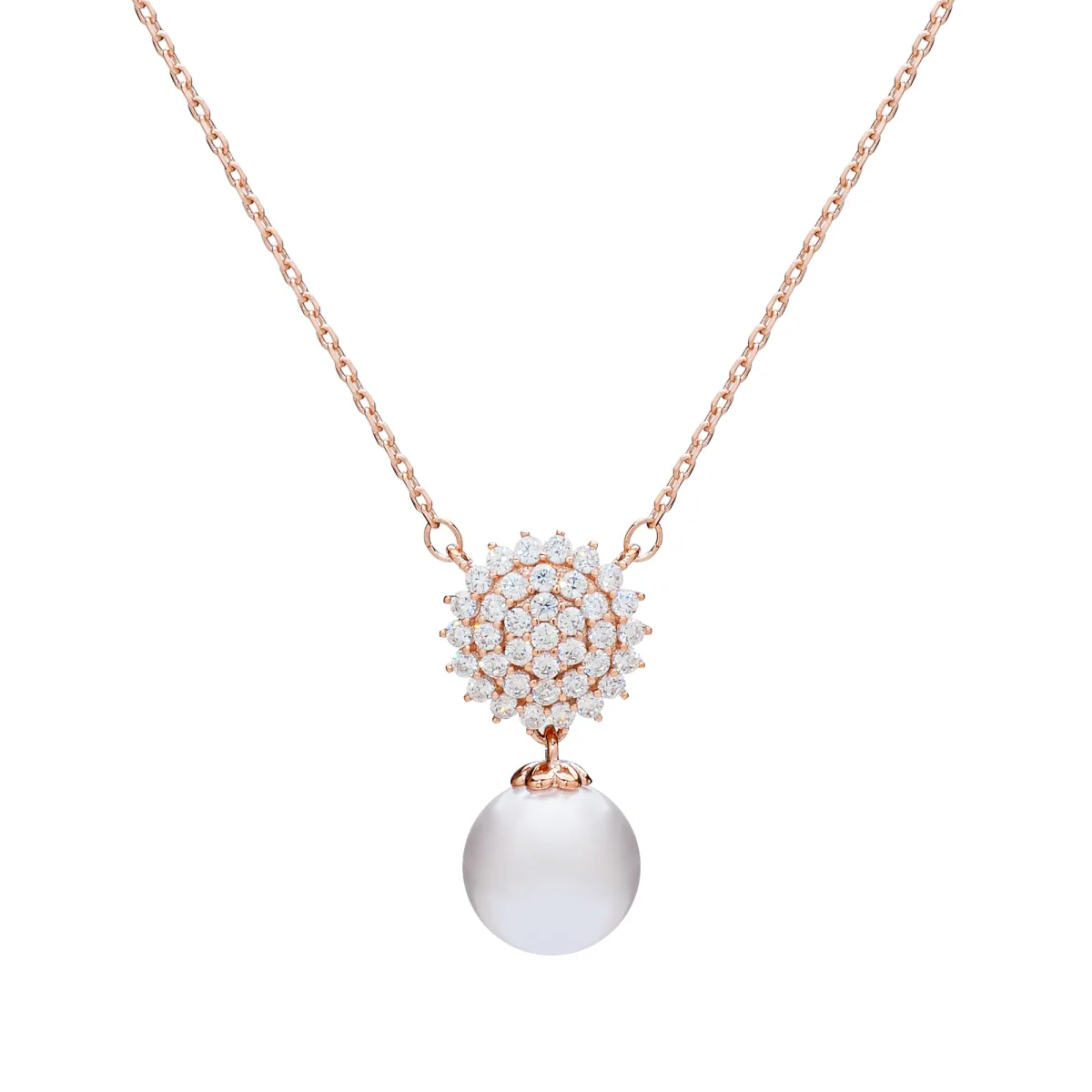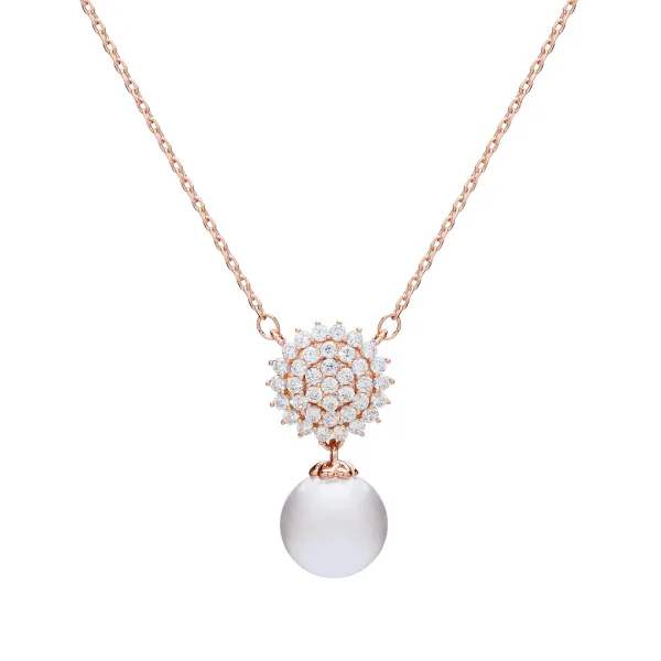 Ketting van 40+5 cm van gerhodineerd metaal met hanger met witte parel en witte kristallen. Gepersonaliseerd label met logo.