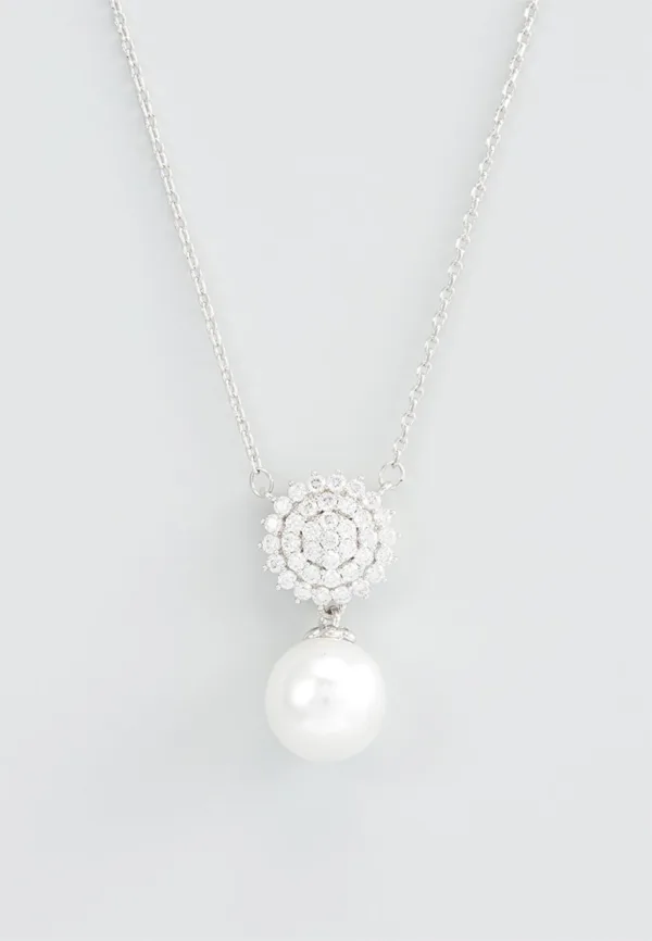 Ketting van 40+5 cm van gerhodineerd metaal met hanger met witte parel en witte kristallen. Gepersonaliseerd label met logo.