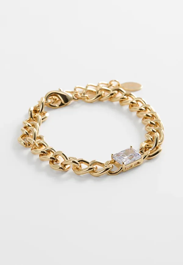 Armband van 17 cm + 3 cm verguld geelgoud met een witte rechthoekige steen. Gepersonaliseerd logolabel.