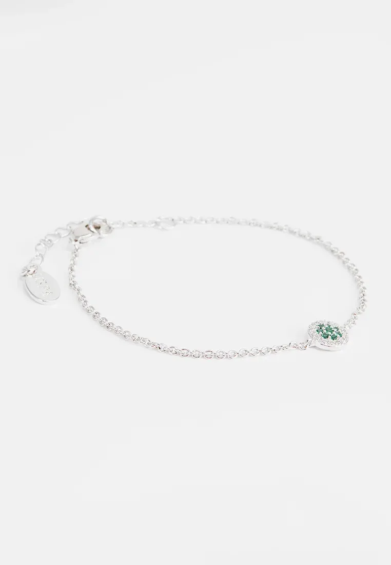 15+4 cm lange armband van gerhodineerd metaal met een centraal rond element met witte en donkergroene kristallen. Gepersonaliseerd logolabel.
