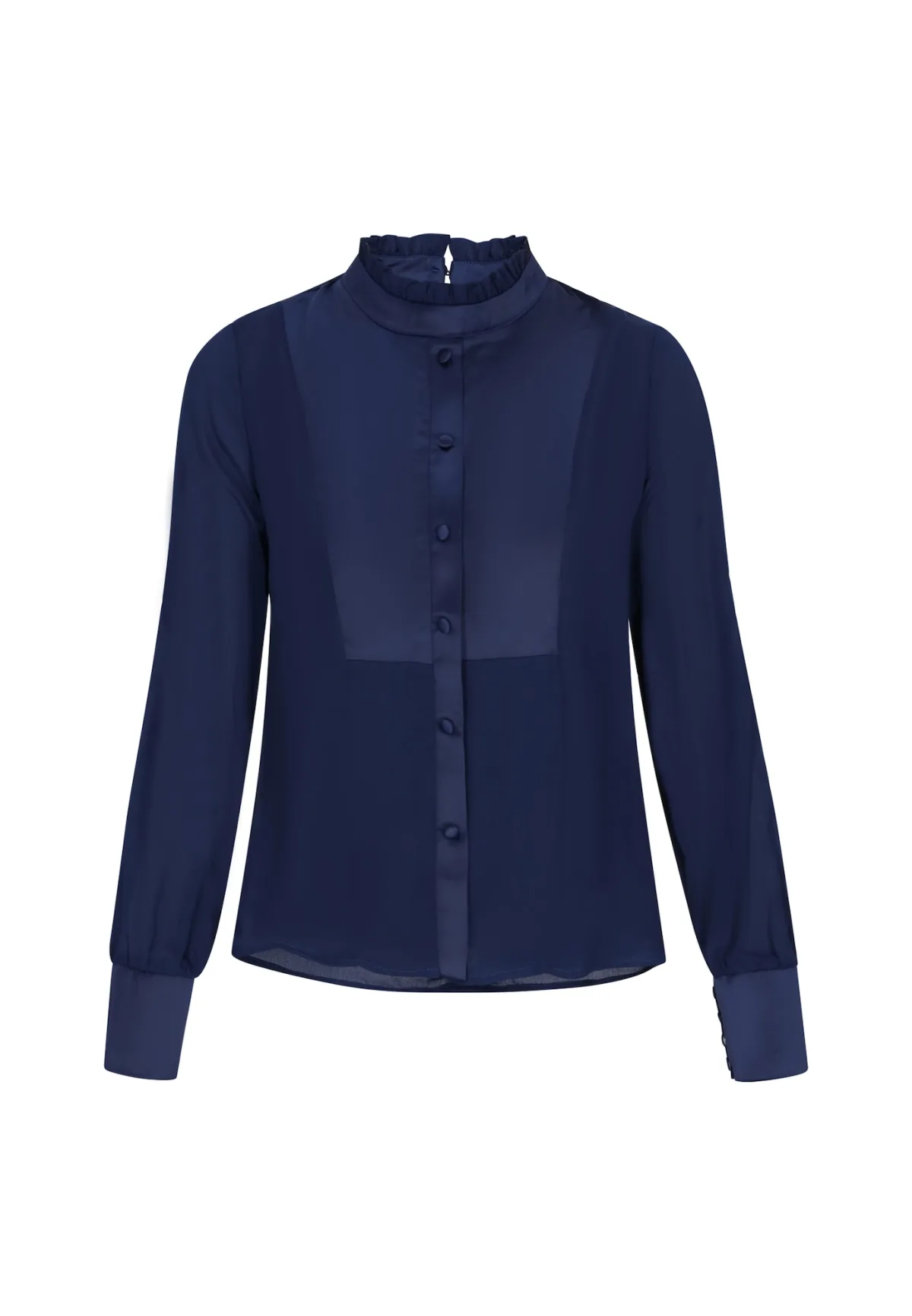 Blouse type: Klassieke blouse; Design: Gevoerde zoom/rand, Knop placket; Type sluiting: Knoopsluiting; Motief: Effen; Kraag: Opstaande kraag; Details: Ruches; Extra's: Op staal naden, Gladde stof, Overdekte knopen; Pasvorm: Normale pasvorm; Armlengte: Lange mouw; Lengte: Normale lengte