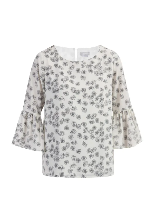 In een flatterende A-lijn en met delicate klokmouwen combineert dit blouseshirt van usha bijzonder goed over een slanke broek. Het ongecompliceerde materiaal is versierd met een delicate bloemenprint, terwijl een soepele voering voor ondoorzichtigheid zorgt. Het ontwerp wordt afgerond door de ronde halslijn met een knoopje achter.