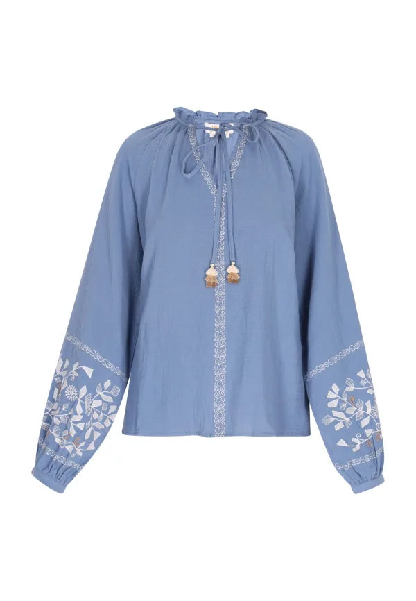 Dompel jezelf onder in de moeiteloze charme van deze blouse, ontworpen voor een ontspannen en luchtig silhouet. De ronde halslijn met intrigerend keyhole detail zorgt voor een vleugje allure en wordt afgesloten door een vetersluiting met speelse kwastjesaccenten. Lange mouwen met elastische manchetten bieden comfort en stijl. Fijne geborduurde of gedrukte patronen sieren de voorkant en de mouwen en zijn voorzien van bloemmotieven en decoratieve randen. Blouse