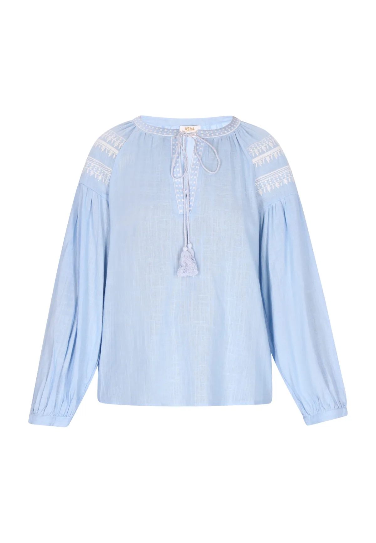 Omarm een bohemien-esthetiek met deze stijlvolle blouse. De ronde halslijn met inkeping en vetersluiting, versierd met kwastjes, straalt een vrijheidslievende charme uit. De lange mouwen lopen uit in elastische manchetten voor een subtiel pofeffect. Horizontaal borduursel voegt textuur toe aan de lichtgewicht stof, waardoor een zwierige pasvorm ontstaat die moeiteloos chic is. Blouse