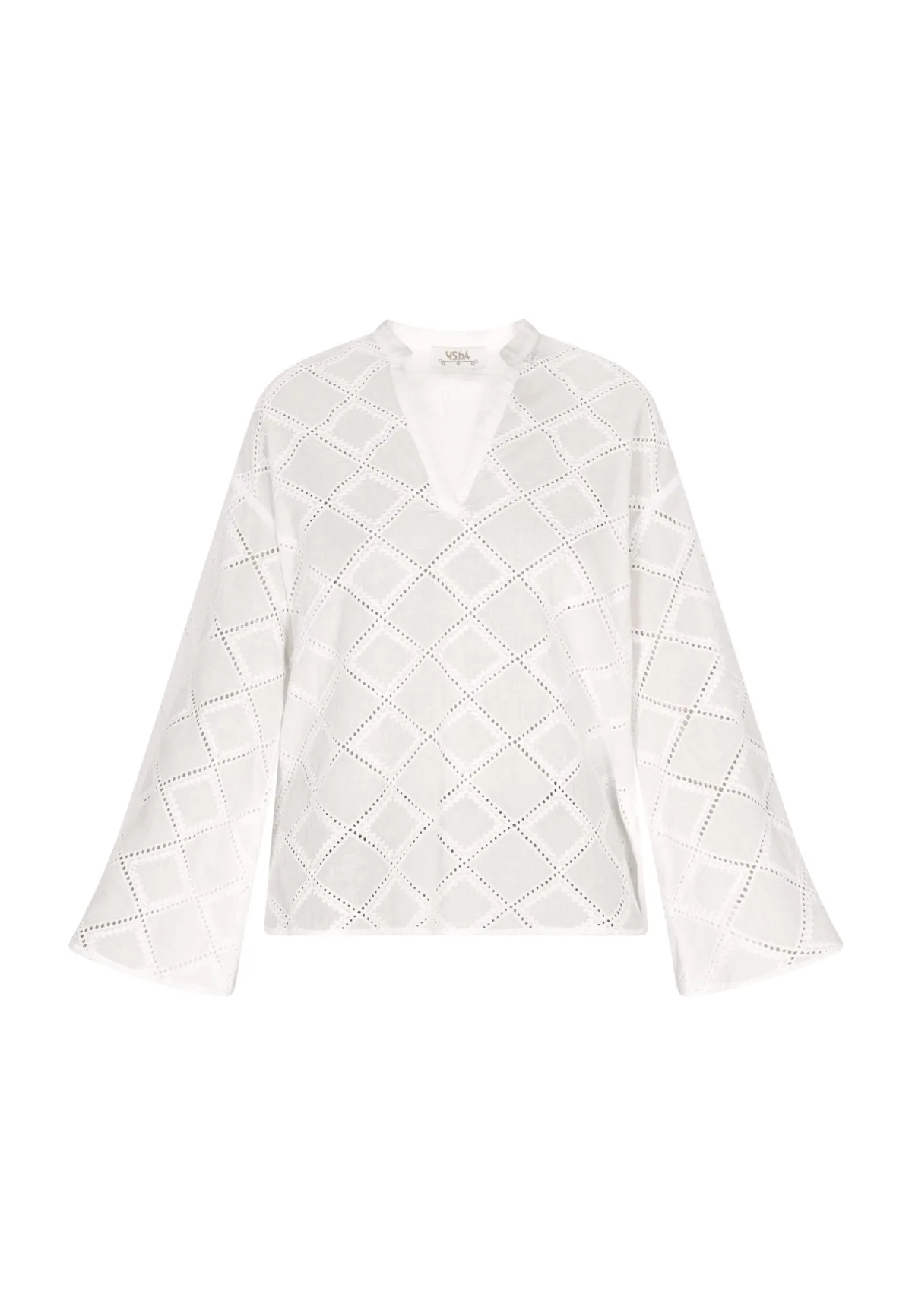 Met een fascinerend geometrisch patroon en uitlopende klokmouwen straalt deze blouse moderne charme uit. De V-hals voegt een vleugje verfijning toe, terwijl de semi-transparante structuurstof een interessant rastereffect creëert. Met een losse pasvorm en vloeiende drapering is dit kledingstuk zowel stijlvol als comfortabel. Afgewerkt met een rechte zoom en een discreet merklabel, perfect om een uniek tintje aan je garderobe toe te voegen. Blouse