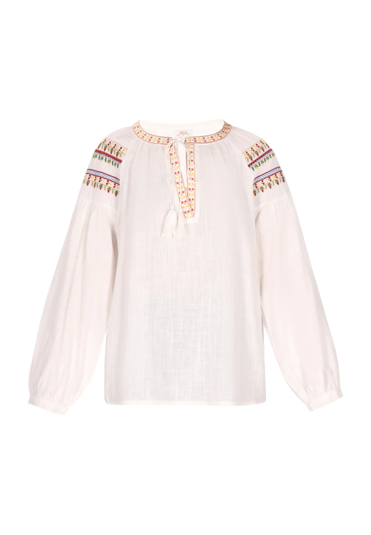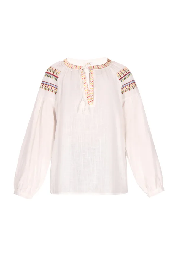 Omarm een bohemien-esthetiek met deze stijlvolle blouse. De ronde halslijn met inkeping en vetersluiting, versierd met kwastjes, straalt een vrijheidslievende charme uit. De lange mouwen lopen uit in elastische manchetten voor een subtiel pofeffect. Horizontaal borduursel voegt textuur toe aan de lichtgewicht stof, waardoor een zwierige pasvorm ontstaat die moeiteloos chic is. Blouse