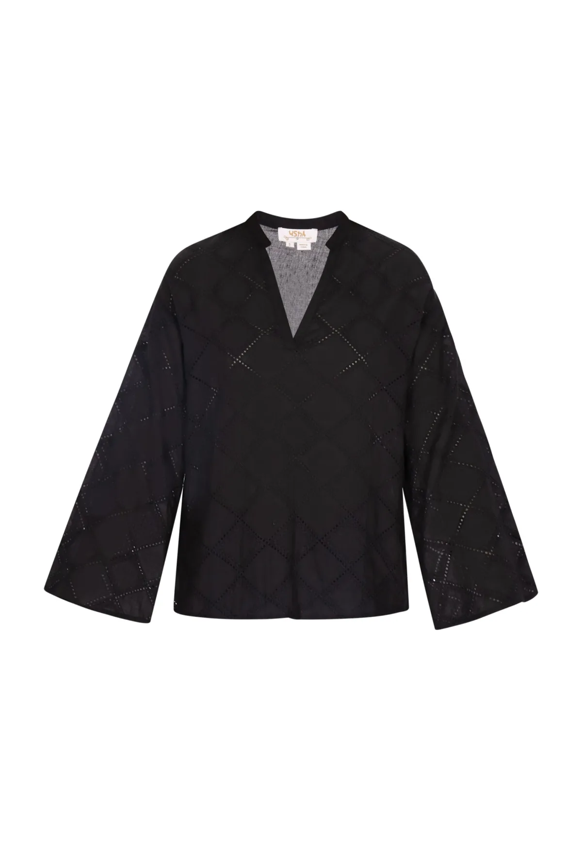 Met een fascinerend geometrisch patroon en uitlopende klokmouwen straalt deze blouse moderne charme uit. De V-hals voegt een vleugje verfijning toe, terwijl de semi-transparante structuurstof een interessant rastereffect creëert. Met een losse pasvorm en vloeiende drapering is dit kledingstuk zowel stijlvol als comfortabel. Afgewerkt met een rechte zoom en een discreet merklabel, perfect om een uniek tintje aan je garderobe toe te voegen. Blouse