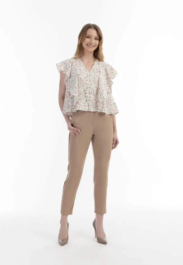 De blouse van usha presenteert zich met vrouwelijke attitude. De delicate bloemenprint, de flatterende V-halslijn en de fijne, met stof bedekte knopen geven de blouse een romantische touch, net als de fladderende volants die als korte mouwen fungeren. Een naad met ruches aan de achterkant zorgt voor een speelse peplum.
