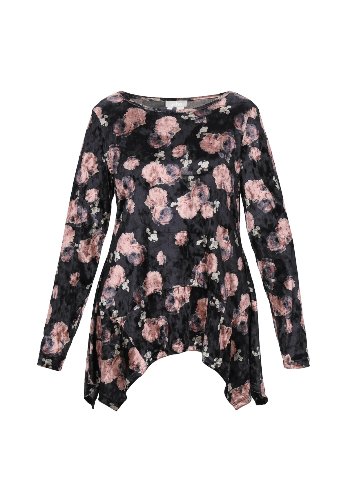 Blouse type: Blouseshirt; Design: Overcut schouder; Type sluiting: Slip; Materiaal: Fluweel/Nicky Velours; Motief: Bloemenprint; Kraag: Zonder kraag; Details: Volant; Extra’s: All-over patroon; Pasvorm: Normale pasvorm; Armlengte: Lange mouw; Lengte: Normale lengte