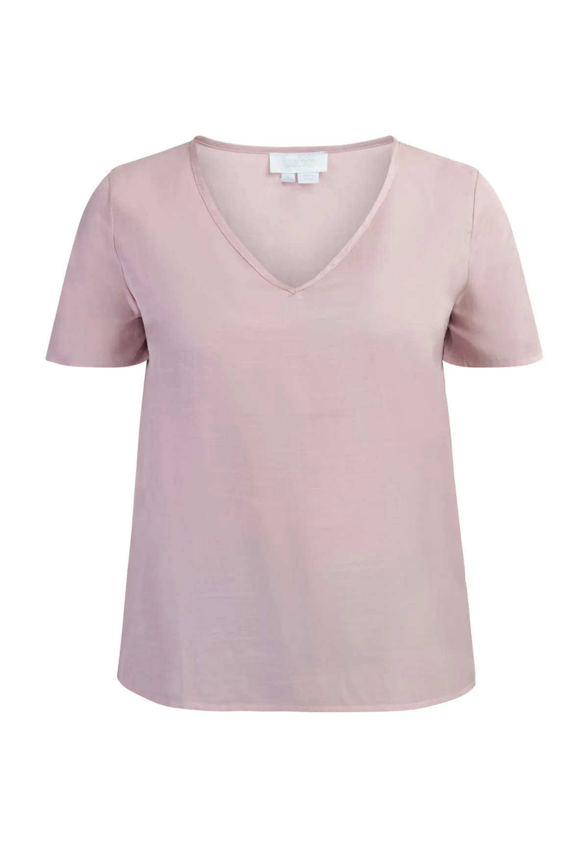 Minimaal qua design, maximaal qua look. Deze blouse van usha WHITE LABEL geeft je outfits een heel bijzonder tintje. Het elegante, semi-transparante materiaal heeft een elegante glans en een vrouwelijke V-hals. Het losse basissilhouet is afgewerkt met een rechte zoom en korte mouwen. Blouse