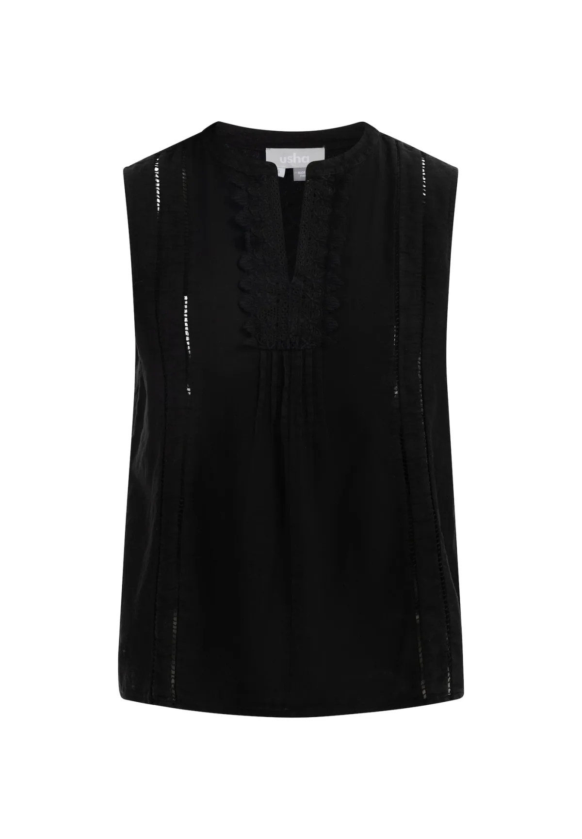 Blouse type: Blouseshirt; Materiaal: Linnen; Halstype: Uitgesneden hals; Motief: Effen; Kraag: Tuniek kraag; Soort bandjes: Brede bandjes; Details: Plooien, Mesh; Pasvorm: Normale pasvorm; Armlengte: Mouwloos; Lengte: Normale lengte