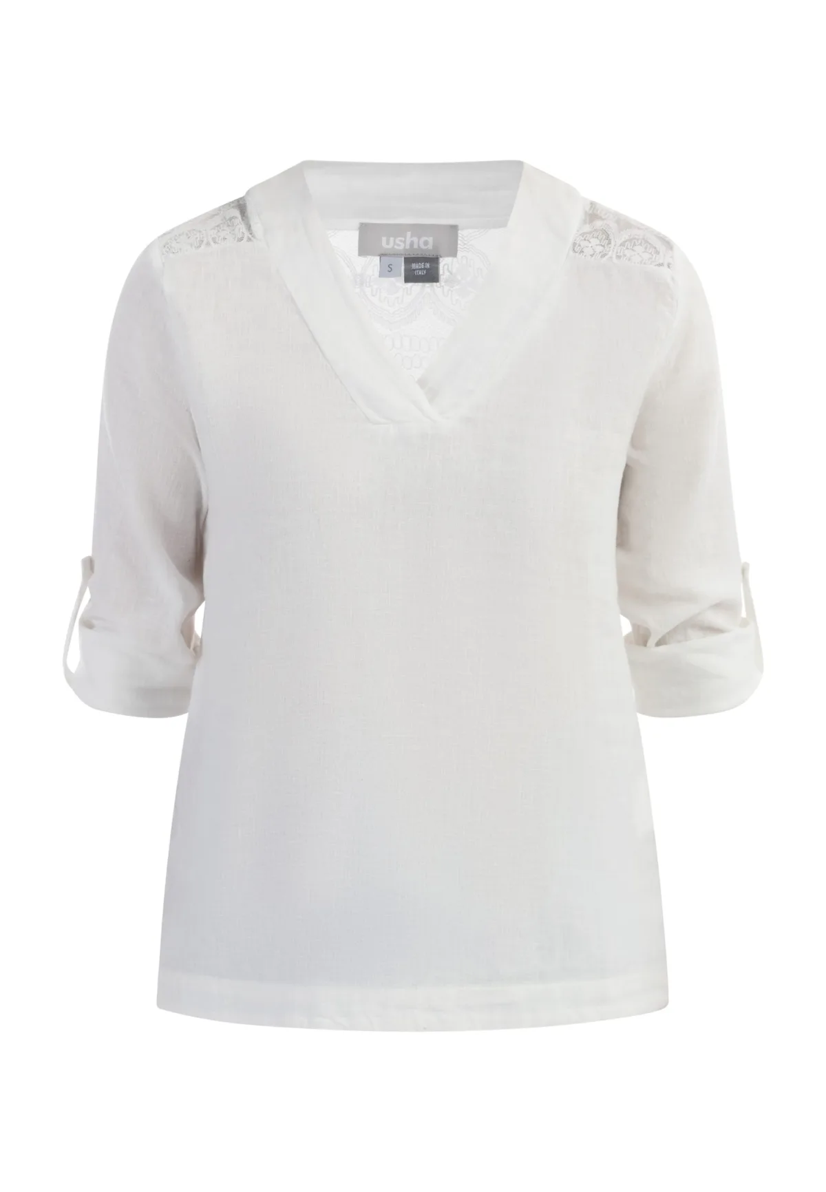 Met zijn lichte linnen-viscose kwaliteit is de blouse van usha made in Italy onze favoriet voor de zomer. De vrouwelijke V-hals zet de toon aan de voorkant, terwijl het delicate, transparante kant op de schouder en achterkant het shirt een prachtige delicatesse geeft. Dankzij de armbanden kunnen de lange mouwen halverwege vastgezet worden waardoor een geslaagde afwerking ontstaat. Bloes met lange mouwen