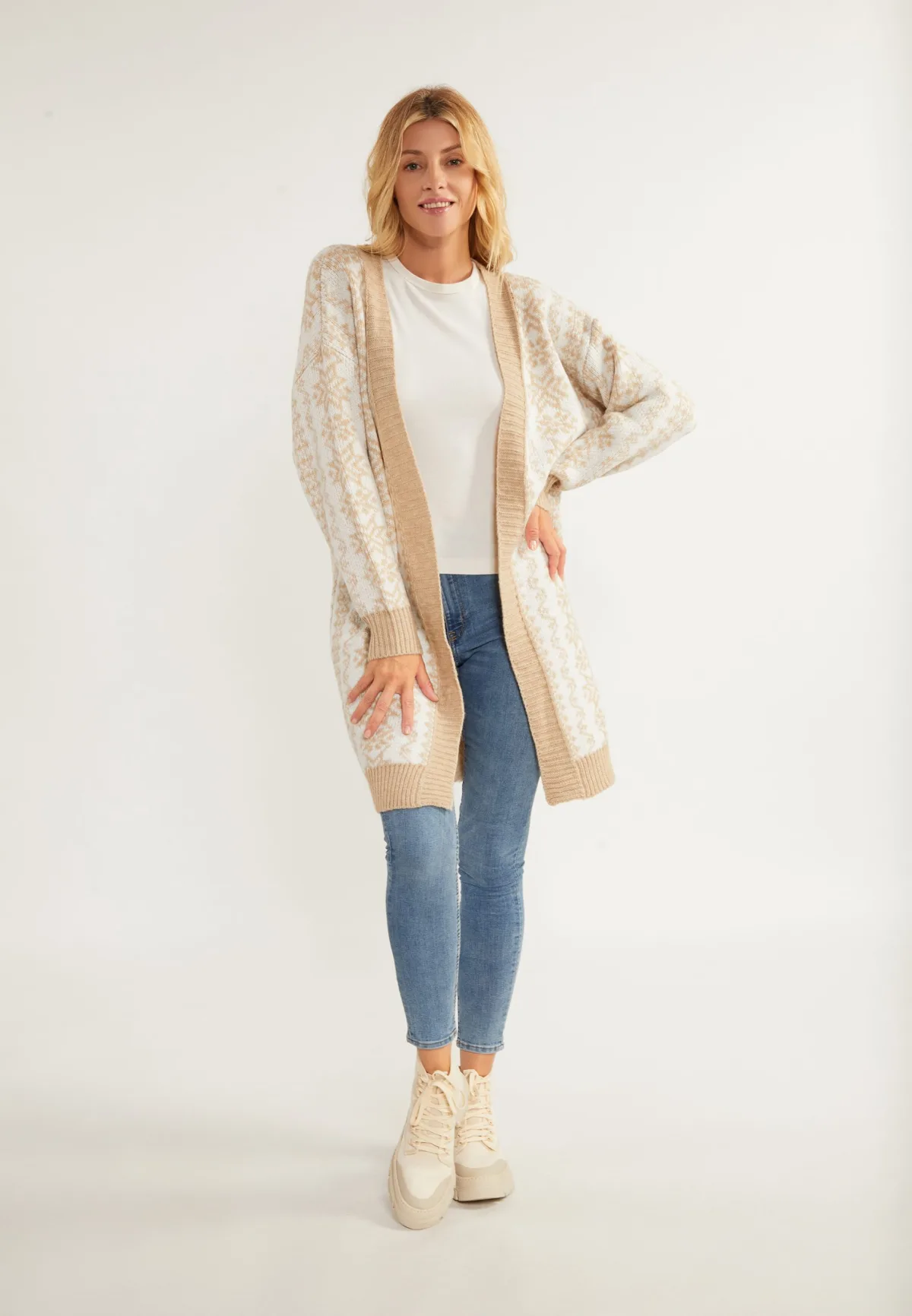 Met veel winterse charme presenteert usha BLUE LABEL dit lange, open gebreide vest van een zachte, rekbare garenmix. Met het seizoenspatroon van sneeuwkristallen zien we onszelf al gezellig thuis, op een huttenfeest of bij de après-ski.