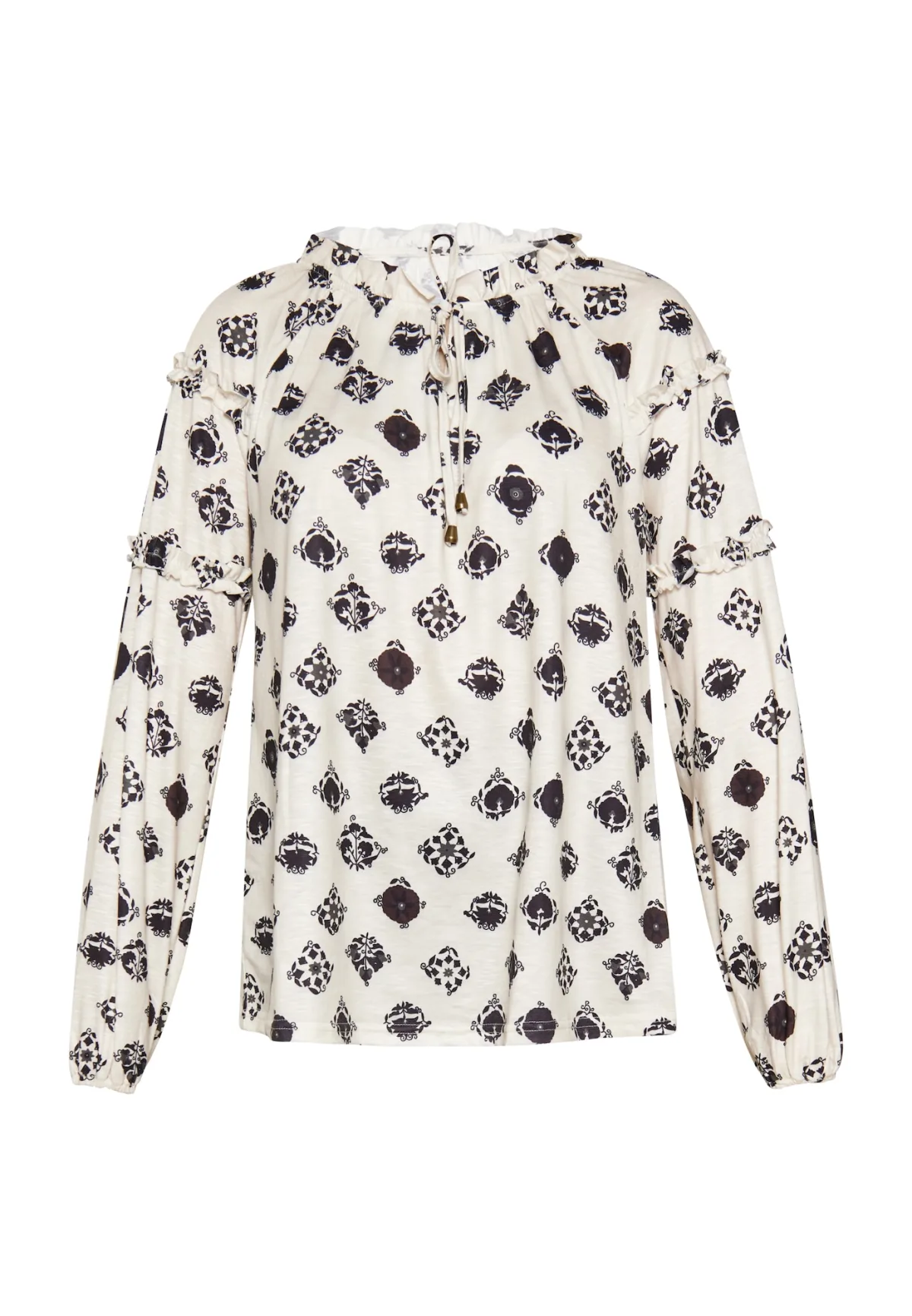 Blouse type: Blouseshirt; Design: Raglanmouwen, Om te knopen/binden; Kraag: Opstaande kraag; Details: Ruches; Extra's: All-over patroon; Pasvorm: Losse pasvorm; Armlengte: Lange mouw; Lengte: Normale lengte