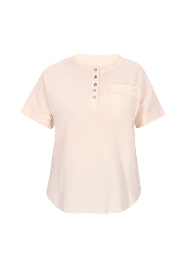 Blouse type: Wijde blouse; Design: Gefranjerde zoom, Borstzak; Type sluiting: Knoopsluiting; Materiaal: Katoen; Motief: Effen; Kraag: Zonder kraag; Details: Franjes; Extra's: Op staal naden; Pasvorm: Normale pasvorm; Armlengte: Kwartmouw; Lengte: Normale lengte