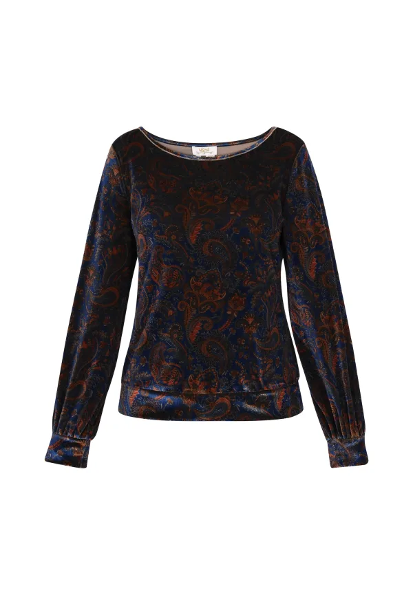 Blouse type: Blouseshirt; Design: Overcut schouder; Type sluiting: Slip; Materiaal: Fluweel/Nicky Velours; Motief: Paisley; Kraag: Zonder kraag; Extra’s: All-over patroon; Pasvorm: Normale pasvorm; Armlengte: Lange mouw; Lengte: Normale lengte