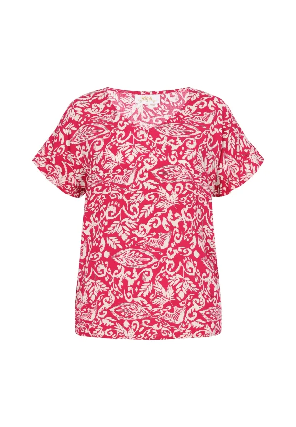 Blouse type: Blouseshirt; Design: Gevoerde zoom/rand; Type sluiting: Slip; Materiaal: Viscose; Kraag: Zonder kraag; Details: Ruches; Extra's: All-over patroon; Pasvorm: Normale pasvorm; Armlengte: Kwartmouw; Lengte: Normale lengte