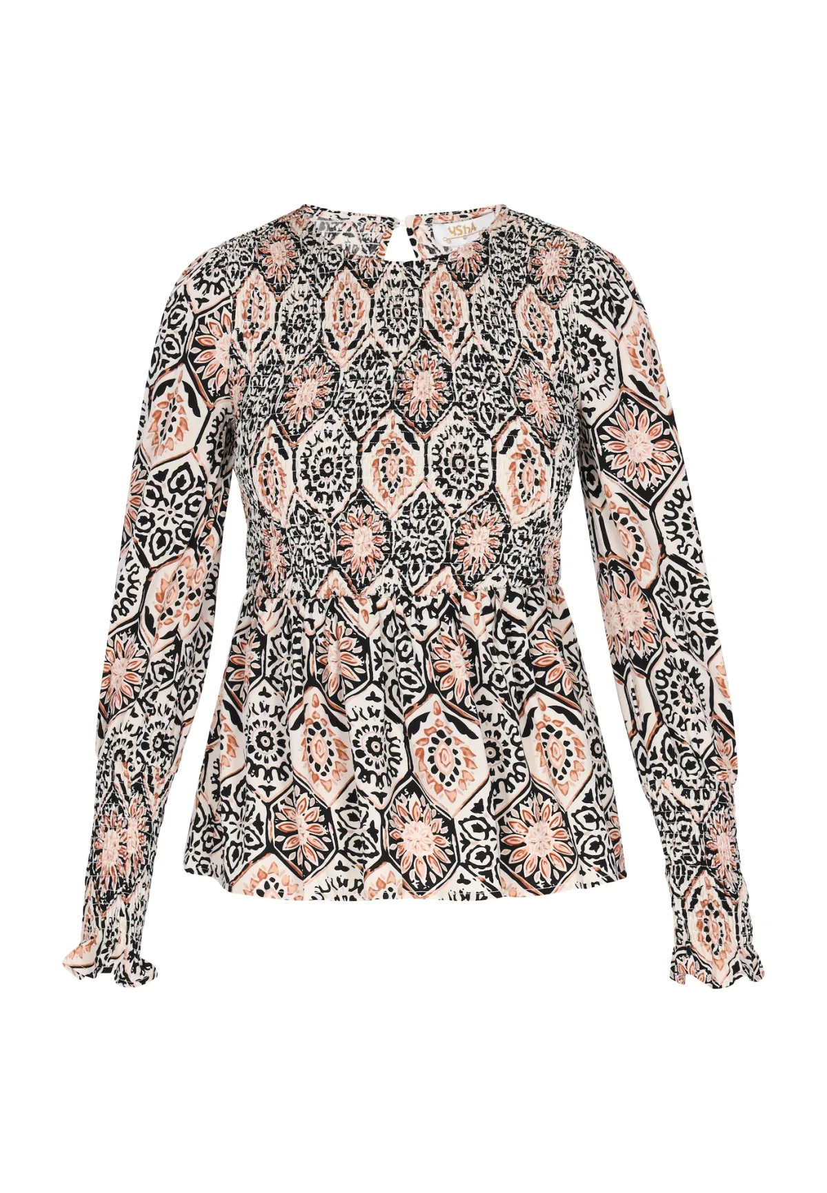 Blouse type: Blouseshirt; Design: Gevoerde zoom/rand; Type sluiting: Knoopsluiting; Materiaal: Viscose; Kraag: Zonder kraag; Details: Gedrapeerd; Extra’s: All-over patroon; Pasvorm: Normale pasvorm; Armlengte: Lange mouw; Lengte: Normale lengte