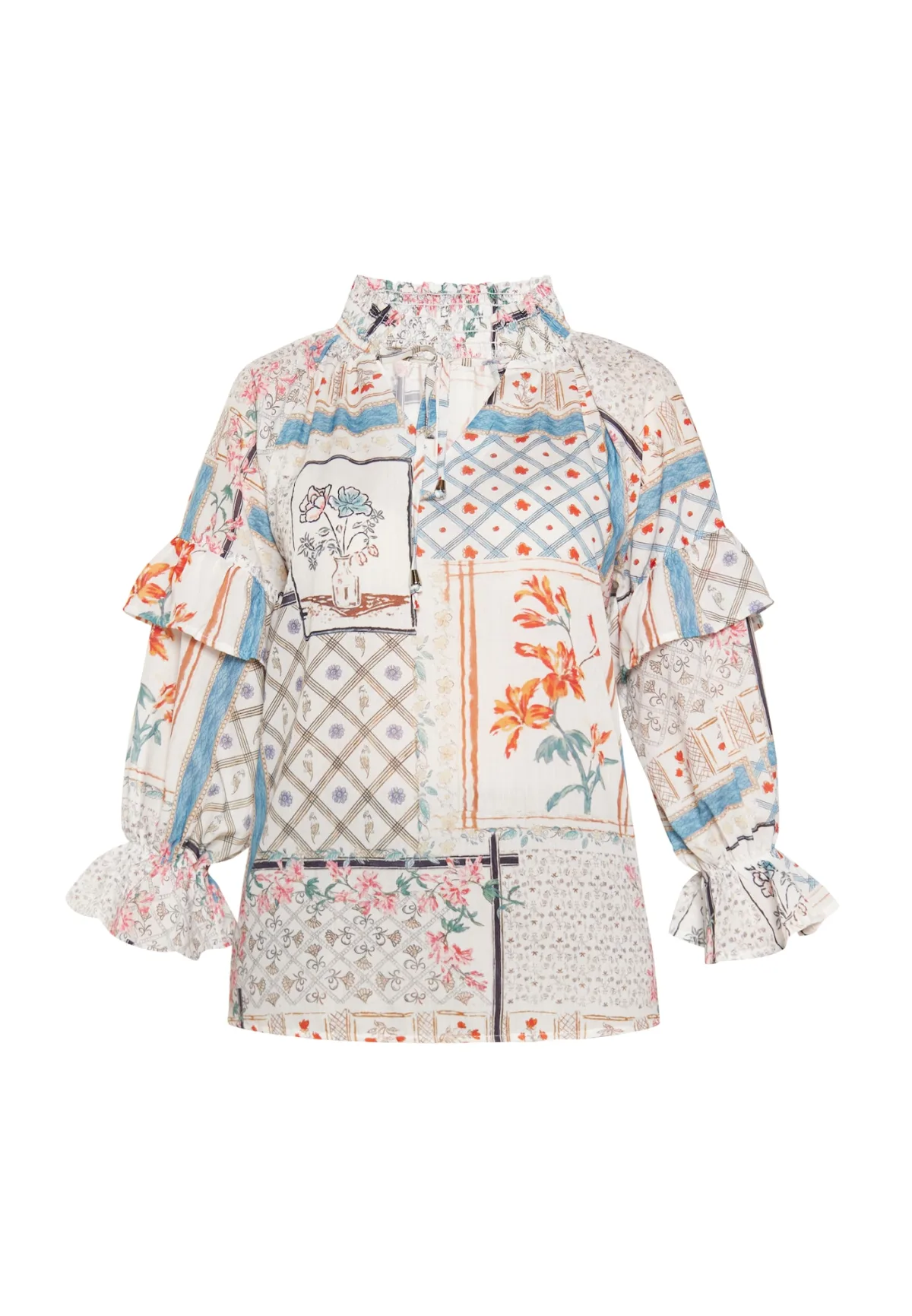 Blouse type: Blouseshirt; Design: Raglanmouwen; Motief: Drukke print; Kraag: Tuniek kraag; Details: Volant; Extra's: All-over patroon; Pasvorm: Losse pasvorm; Armlengte: Lange mouw; Lengte: Normale lengte