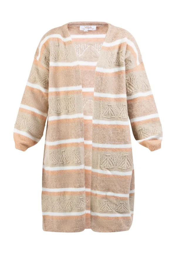 Met dit open vest van usha FESTIVAL krijgt u een geslaagde mix van trend en gezelligheid. Dankzij de comfortabele knielengte en de casual snit is het ideaal om op koudere dagen even snel aan te trekken, terwijl het samenspel van gebreide patronen en strepen dit vest tot een echte blikvanger maakt.