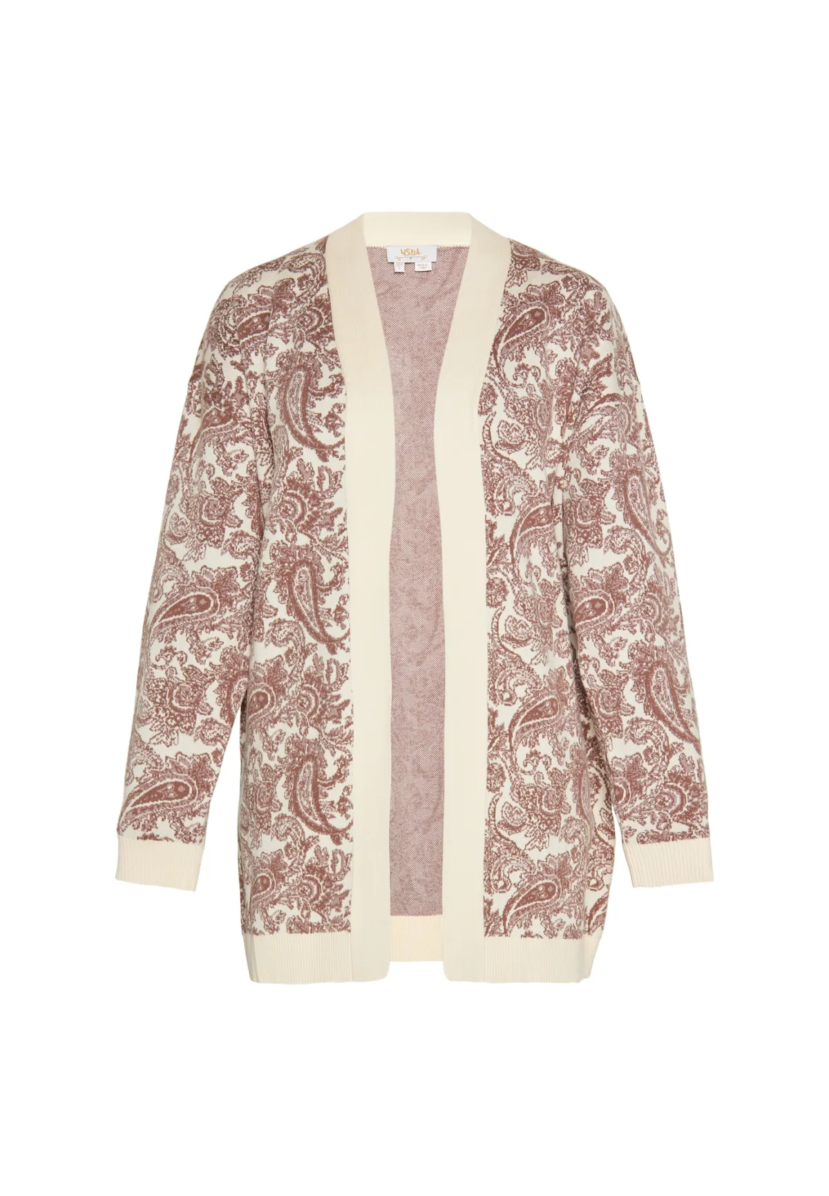 Design: Geribd ceintuurtje; Type sluiting: Open; Materiaal: Knitwear; Motief: Paisley; Extra's: Fully fashioned; Pasvorm: Losse pasvorm; Armlengte: Lange mouw; Lengte: Lange pasvorm