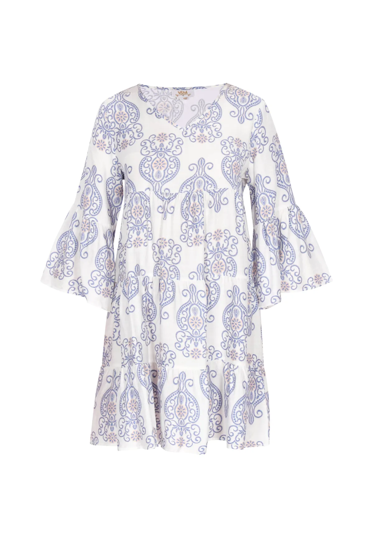 Design: Gevoerde zoom/rand, Trompetmouwen; Materiaal: Viscose; Halstype: V-hals; Motief: Drukke print; Details: Gedrapeerd; Extra's: All-over patroon; Lengte: Kort/mini; Snit: Uitlopend; Pasvorm: Losse pasvorm; Armlengte: Driekwart mouw