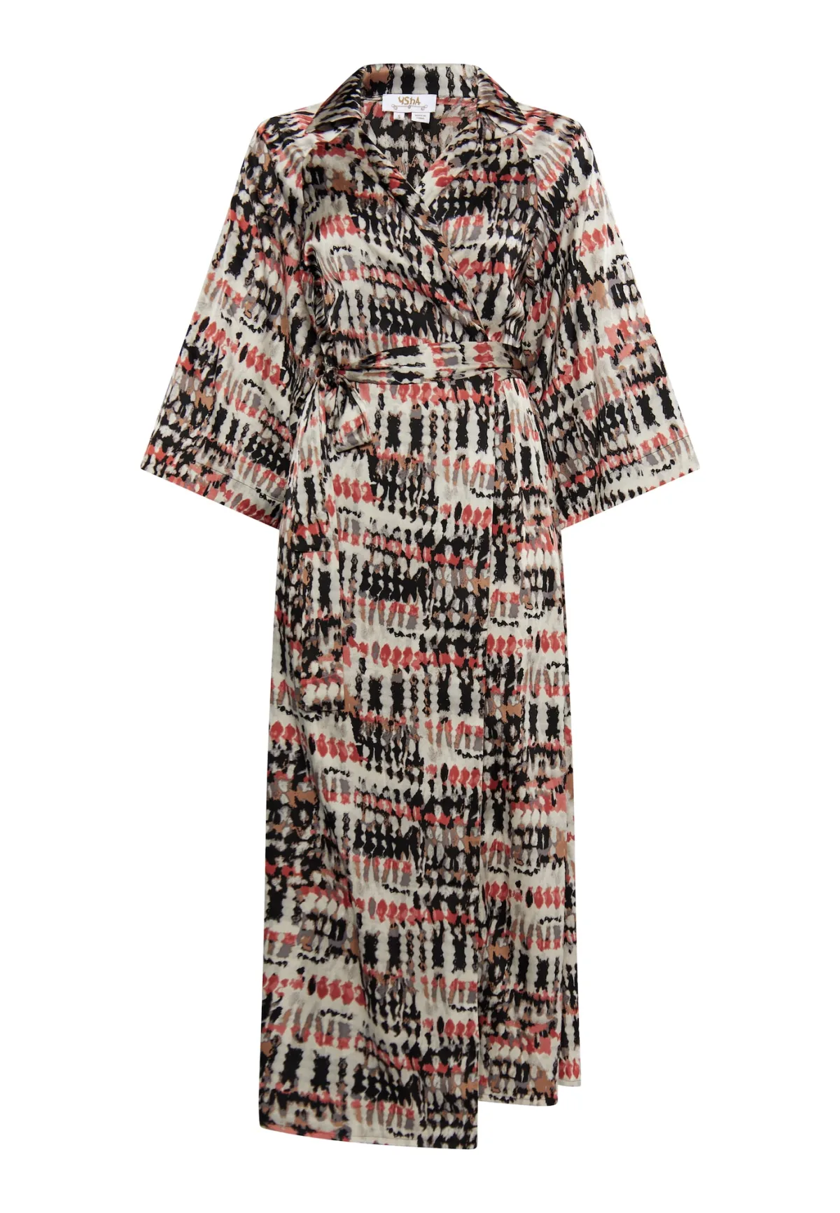De jurk in kimonostijl van usha FESTIVAL overtuigt met een overslag aan de voorkant en wijde driekwartmouwen. Het is gemaakt van kreukvrije stof met een levendige tie-dye print en heeft een kraag met smalle revers. Jurk maxi met lange mouwen