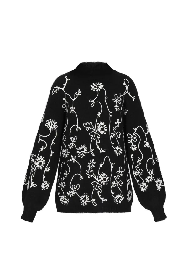Design: Geribbelde kraag, Pofmouwen, Geribd ceintuurtje, Overcut schouder; Type sluiting: Slip; Materiaal: Knitwear; Halstype: Opstaande kraag; Motief: Bloemenprint; Details: Borduursels; Extra's: All-over patroon, Fully fashioned; Pasvorm: Losse pasvorm; Armlengte: Lange mouw; Lengte: Lange pasvorm