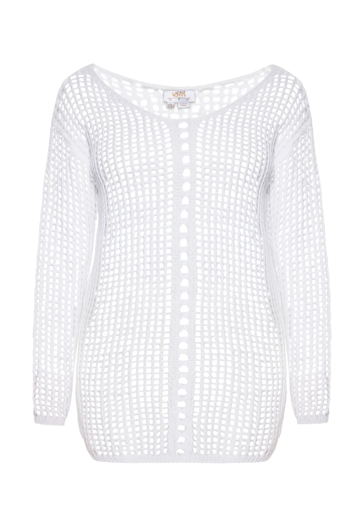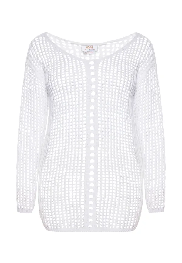 Gebreide trui met lange mouwen en een uniek gatenpatroon dat een delicate, geperforeerde look creëert. De ronde halslijn en rechte zoom geven het een klassieke charme. Het lichtgewicht en ademende materiaal maakt hem perfect voor warmere dagen. Perfect als bikini-cover-up. Jumper