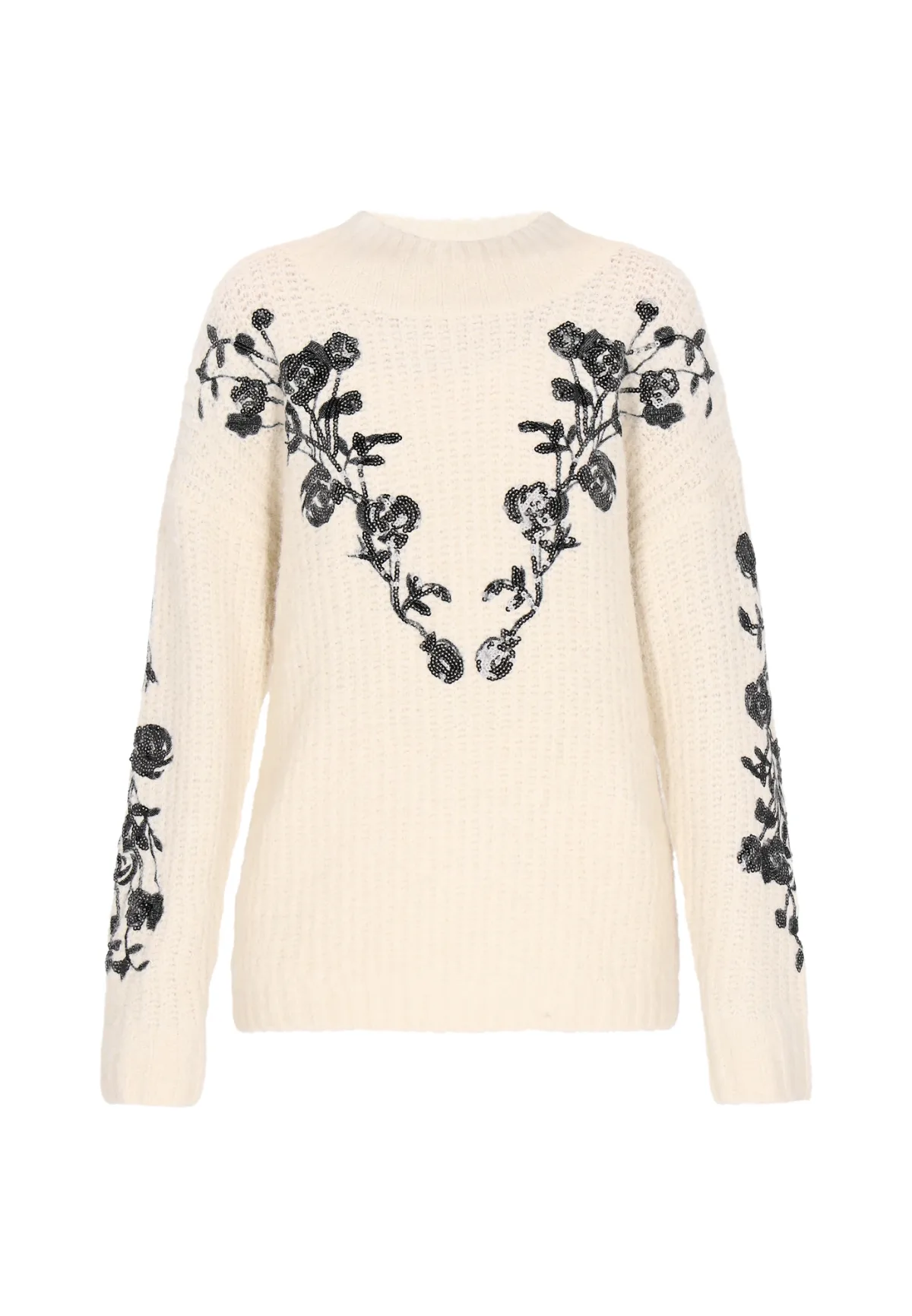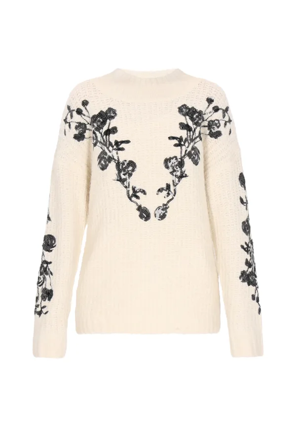 Design: Geribbelde kraag; Materiaal: Knitwear; Halstype: Ronde hals; Motief: Bloemenprint; Details: Pailletten, Borduursels; Extra's: Fully fashioned; Pasvorm: Normale pasvorm; Armlengte: Lange mouw; Lengte: Normale lengte