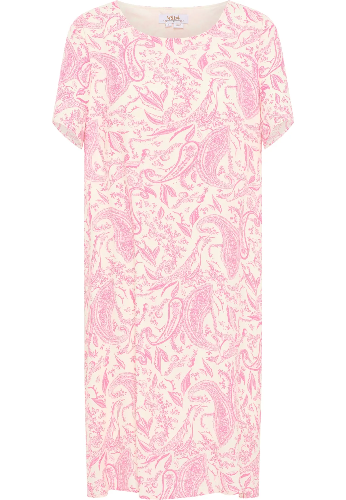 Een jurk, een casual silhouet en een modieuze paisleyprint zijn de ingrediënten voor de boho-stijl van usha FESTIVAL. De lichte, wijde zomerjurk heeft een trendy A-lijn snit en een ronde halslijn. De lichte zomerkwaliteit van pure viscose-crêpe is uiterst comfortabel om te dragen, zelfs op warme dagen. Wat je momenteel ook van plan bent: de jurk in subtiel oversized model wordt een zomerfavoriet. Jurk met korte mouwen