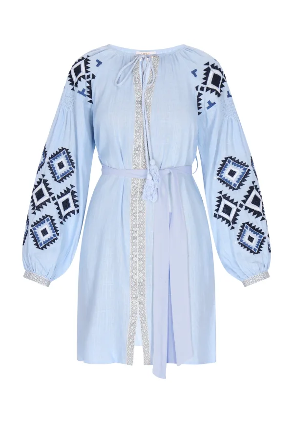 Geef je stijl een boost met deze prachtige mini-jurk met speciale borduurdetails en een vastgebonden halslijn. De lange pofmouwen, geaccentueerd met elastische tape in de manchetten, versterken de elegantie. Deze geborduurde jurk is perfect voor een etnische festivallook en heeft een los silhouet en lichtgewicht materiaal, ideaal voor zomerkleding. Jurk