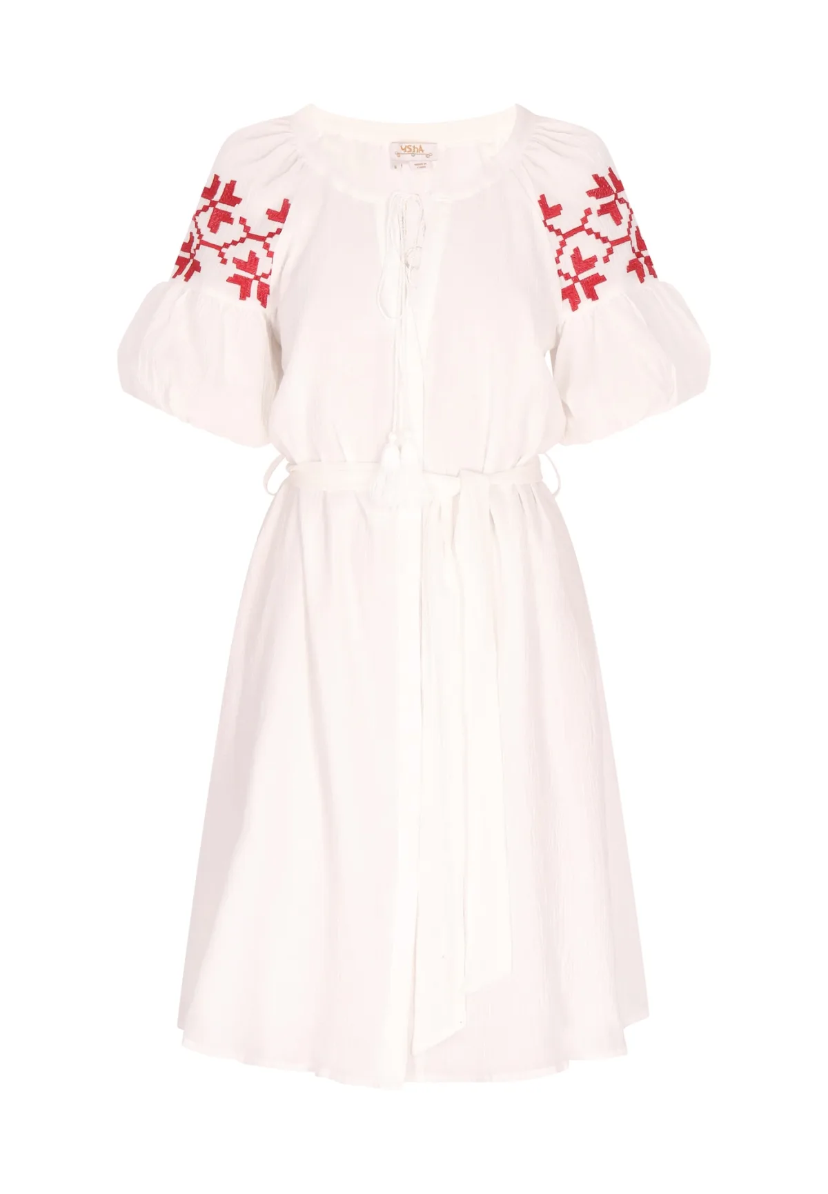 Deze speciale mini-jurk heeft korte mouwen, een vastgebonden halslijn met geborduurde details en een op folk geïnspireerd ontwerp. De taille is nauwsluitend voor een verstelbare pasvorm, terwijl de jurk is geplooid voor een vloeiend silhouet. Deze lange zomerjurk is perfect voor wie op zoek is naar een etnische bohostijl en straalt een casual charme uit met zijn pofmouwen en geometrische patronen op de schouders. Jurk