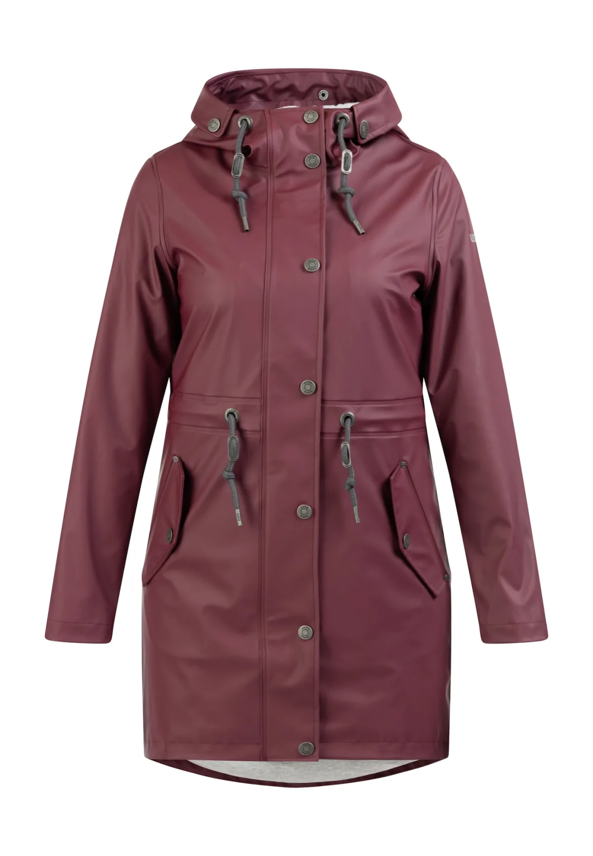 Op regenachtige dagen biedt deze usha mackintosh heerlijke bescherming. Het gecoate materiaal is wind- en waterdicht en nodigt uit tot wandelen in weer en wind. De grote capuchon met gegraveerde oogjes en stijlvolle koorden biedt extra bescherming tegen de regen, die vooral op stormachtige dagen goed van pas komt. Ook de drukknoopsluiting boven de ritssluiting en de schuine klepzakken optimaliseren het jack op het gebied van weersbestendigheid. De zachte jersey voering zorgt voor een aangenaam draagcomfort.