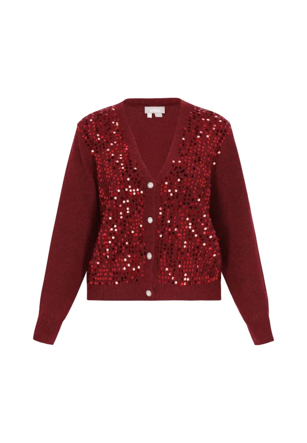Design: Knop placket, Geribd ceintuurtje; Type sluiting: Knoopsluiting; Materiaal: Knitwear; Halstype: V-hals; Motief: Effen; Details: Pailletten; Extra's: Applicaties; Pasvorm: Normale pasvorm; Armlengte: Lange mouw; Lengte: Normale lengte